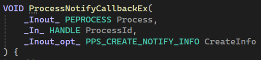 The solution is the most boring and common PsSetCreateProcessNotifyRoutineEx. This routine registration function allows us to create a callback on process creation and/or termination.