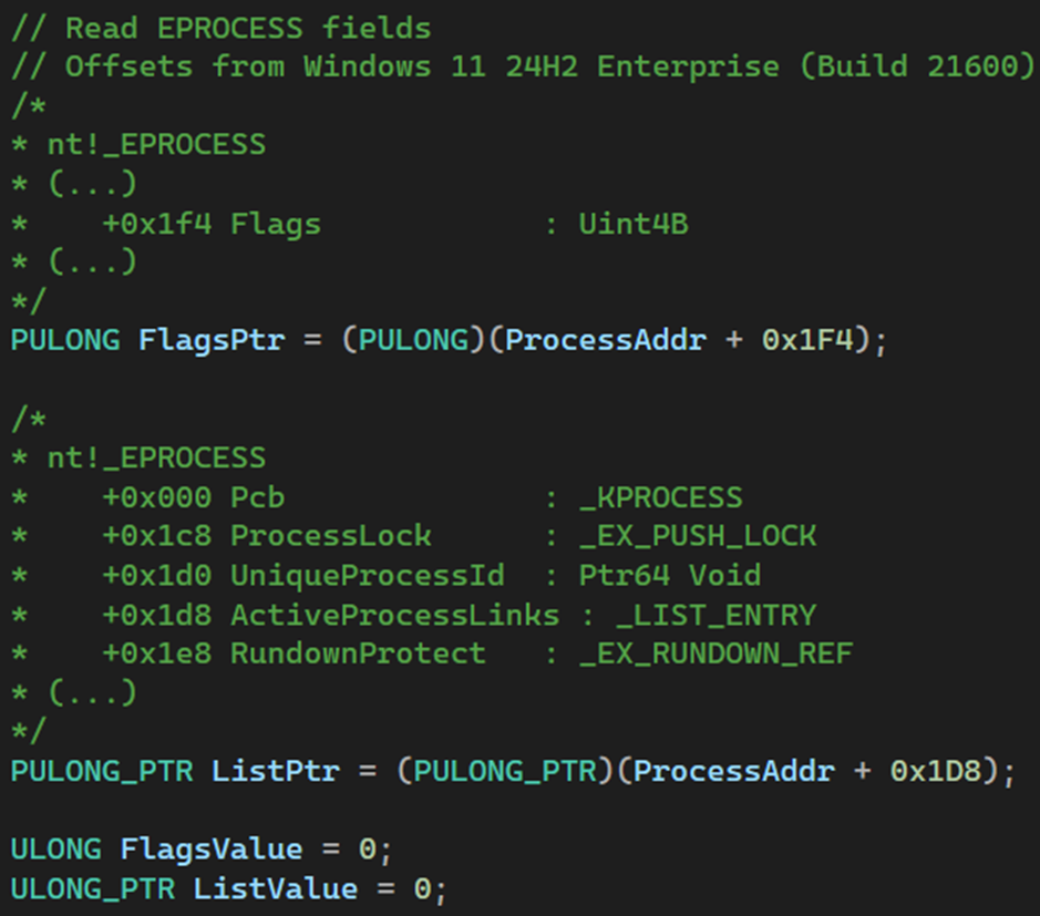 First thing we have got to do is to extract the ActiveProcessLinks of the process. We will do that for every process that is terminated. We can verify if the process is terminating by checking if CreateInfo is null. In my example, I also extract flags just for the test’s purposes.